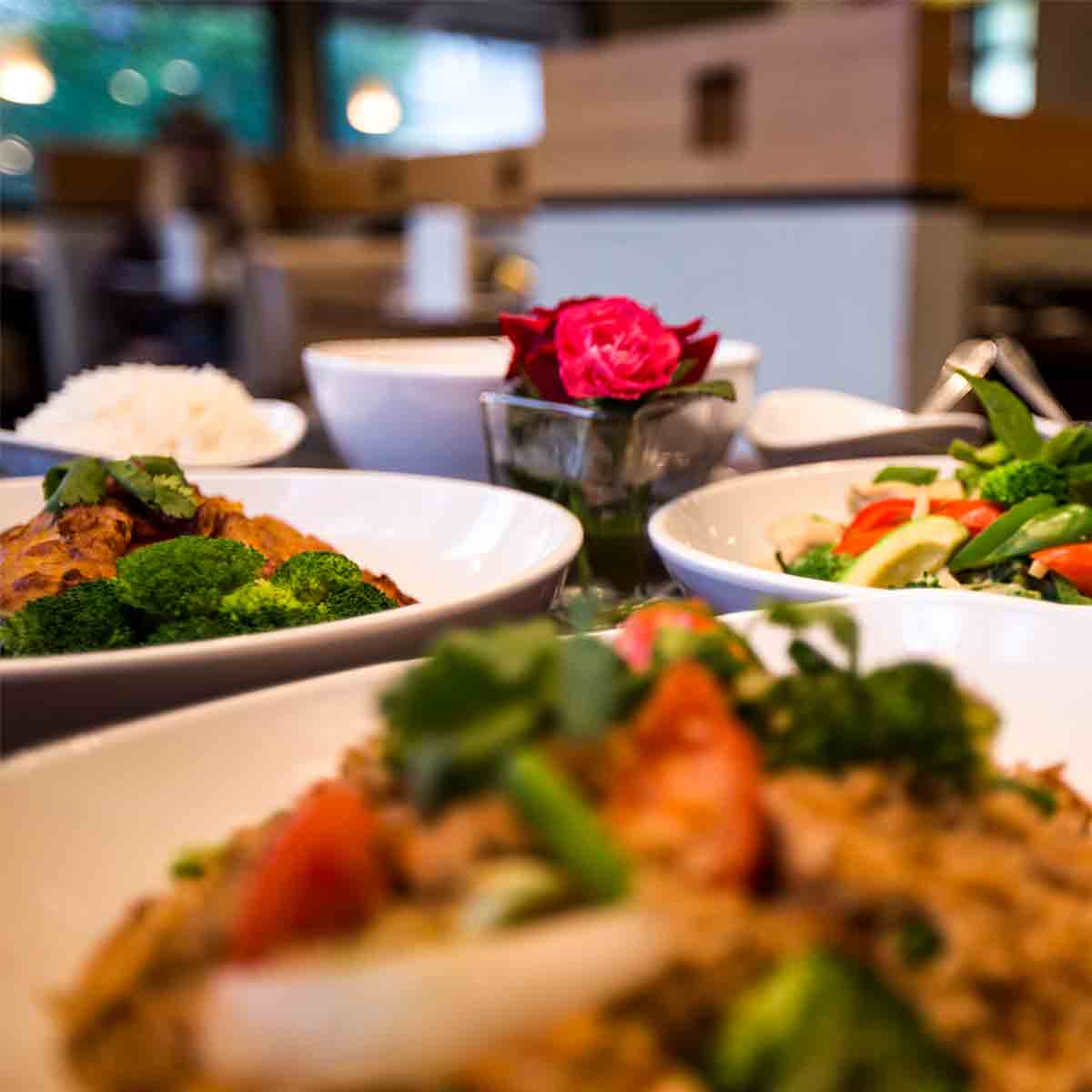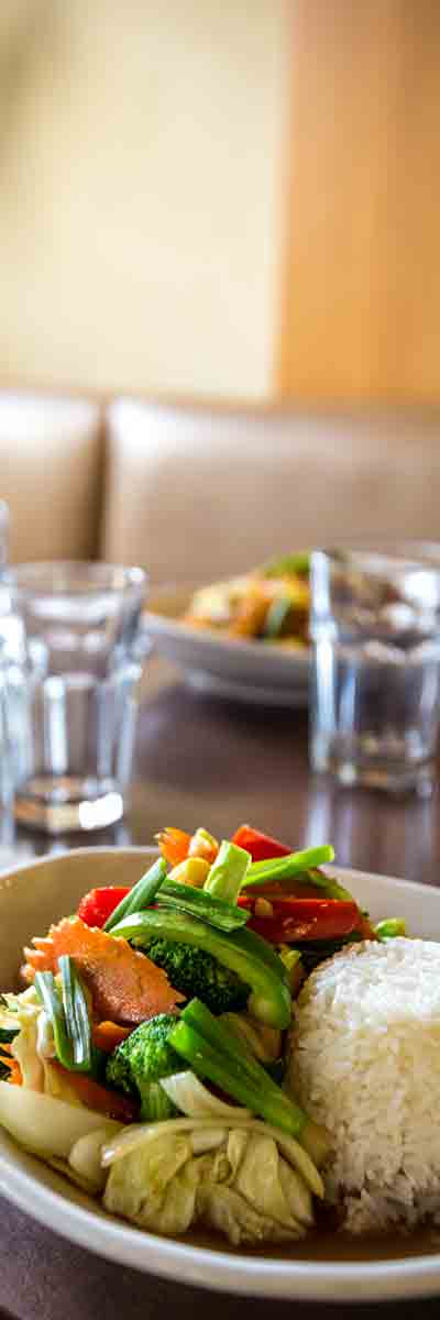 - Wide rice noodles, broccoli, carrot, baby corn, mushrooms, brown Thai gravy