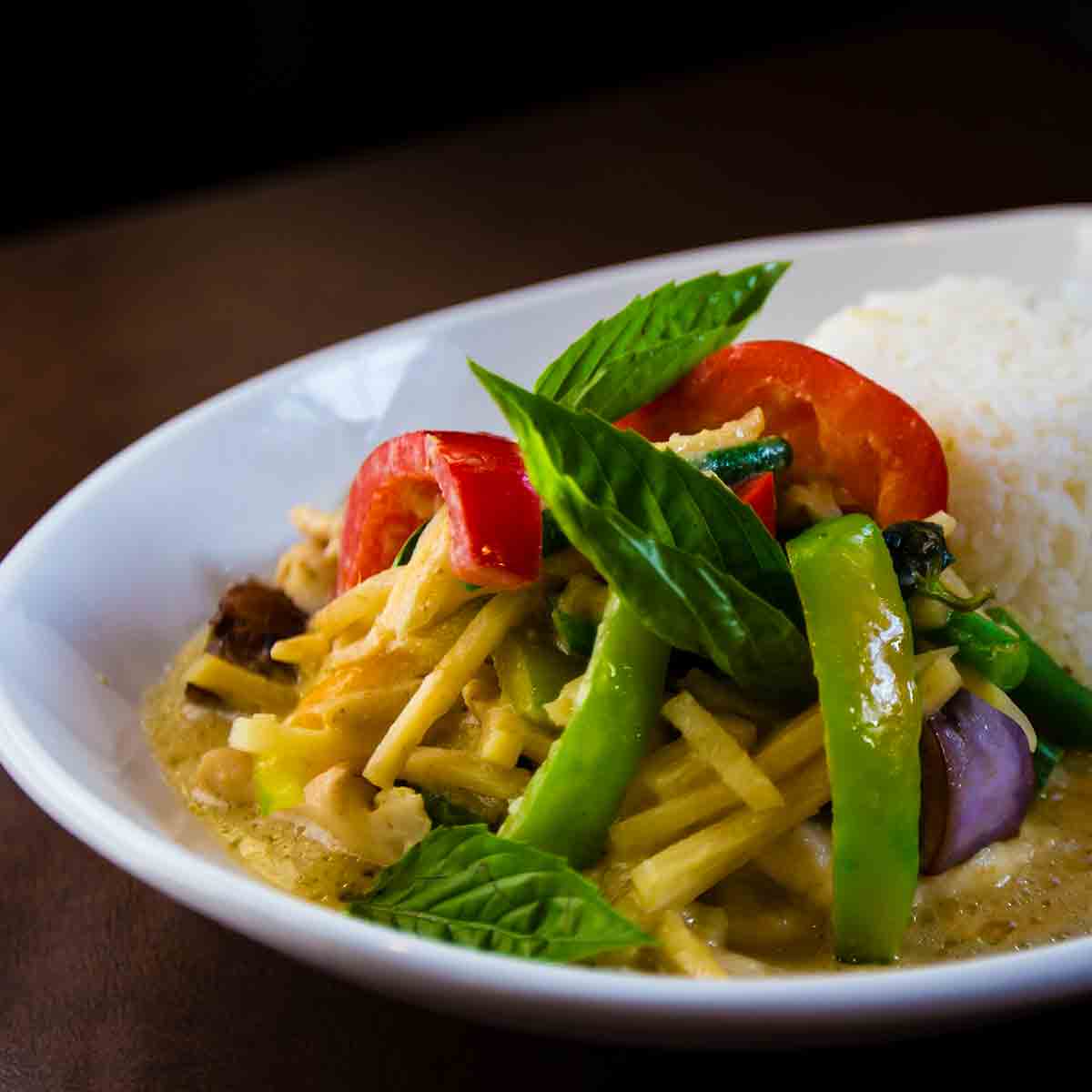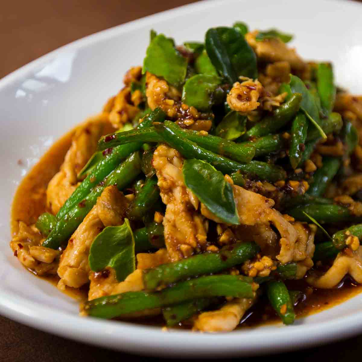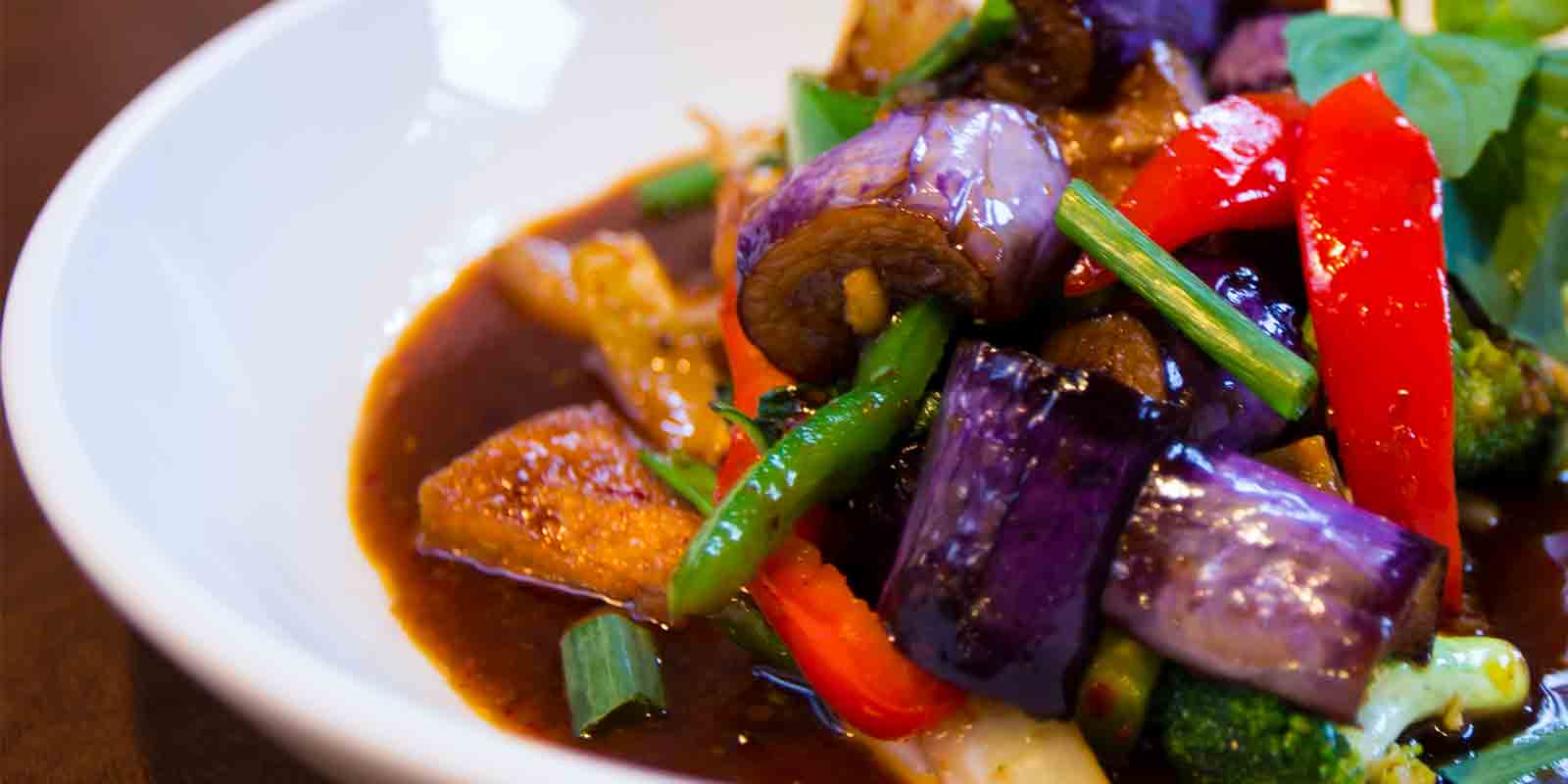 - Eggplant, bamboo shoots, bell pepper, green beans, basil